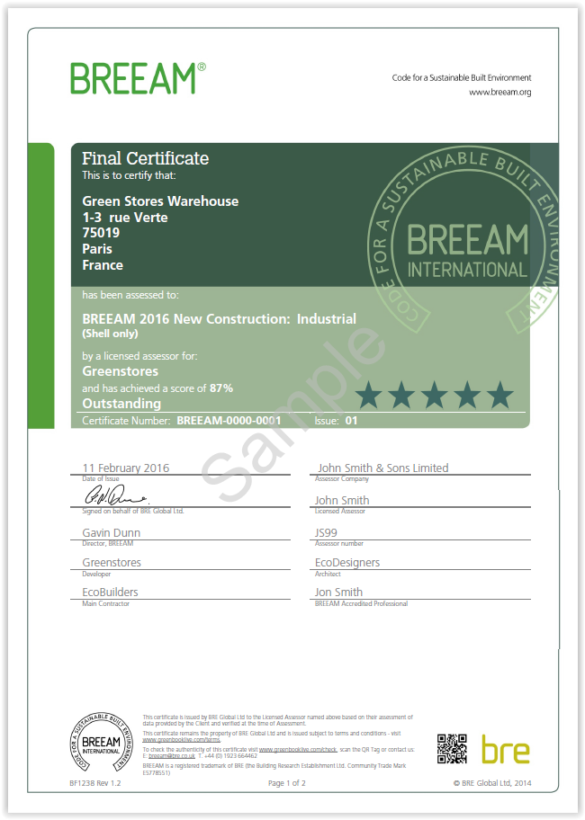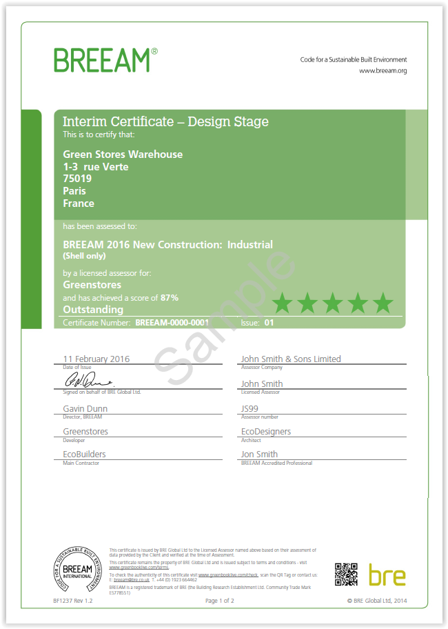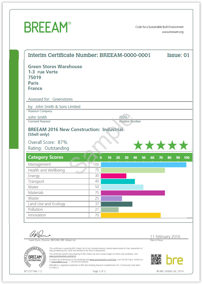 Examples of BREEAM New Construction certificates for the interim Design Stage and final Post-construction stage are provided in Figure 7 and Figure 8 , respectively.